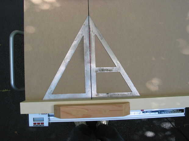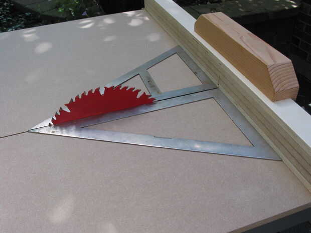 La razón que me gusta este método es que, si su guía no es perfectamente recta, la hoja está torcida o fuera de la alineación en la sierra, luego de conseguir que dos triángulos cuadrados a la guía y la hoja al mismo tiempo no va a suceder.