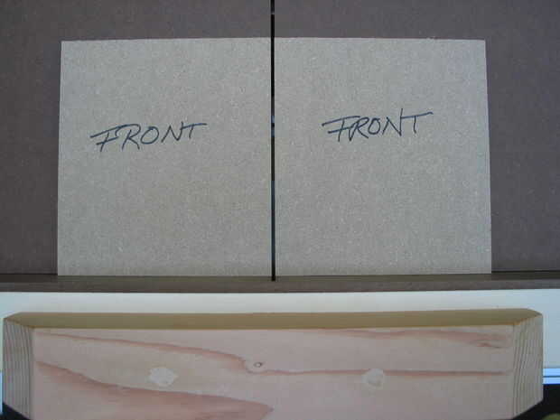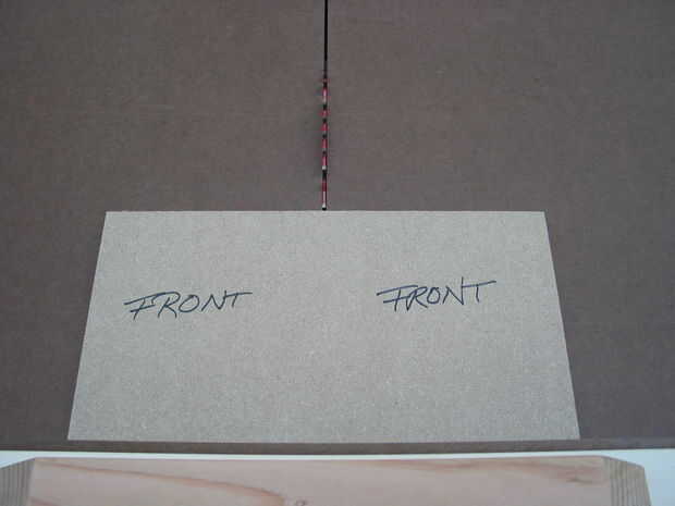 Un corte de prueba es una manera infalible para ver si el trineo está configurado correctamente. Simplemente corte una pieza de buen tamaño de la chatarra (Asegúrese de que tiene derecho, bordes paralelos). Presione la pieza de trabajo contra el tope-guía y cortar en dos pedazos. Deslice el borde para ver si encajan entre sí sin espacios sensibles. Si todo se ve bien, tome una pieza y dale la vuelta (delante hacia atrás) y vuelva a comprobar el ajuste. Cualquier error en el corte no visible en su primera inspección ahora se duplicará y son mucho más evidentes. Como se muestra en las fotos, si los bordes a tope juntos firmemente sin huecos entonces el tope-guía y la hoja están alineados correctamente.