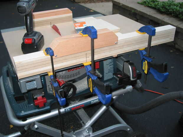 (1) que se valla para el trineo de la abrazadera en la línea de referencia y disparar un clavo pequeño en la parte inferior del patín (en el extremo de la guía de otro extremo roscado). A continuación, con la valla ahora asegurada al trineo, retire la pinza y hacer un corte de prueba * para comprobar si el cuadrado. Si la valla está fuera de escuadra, grifo la cerca con un mazo un poco ajustar el ángulo de la valla, luego hacer una segunda prueba corta y revise de nuevo **. Repita este procedimiento hasta obtener un resultado satisfactorio. Ahora, con la Plaza de guía a la hoja, reclamp y taladrar los agujeros en la valla con los orificios pretaladrados en la base del trineo como guía. Por último, atornillar la guía con tornillos de 2" de madera largos.