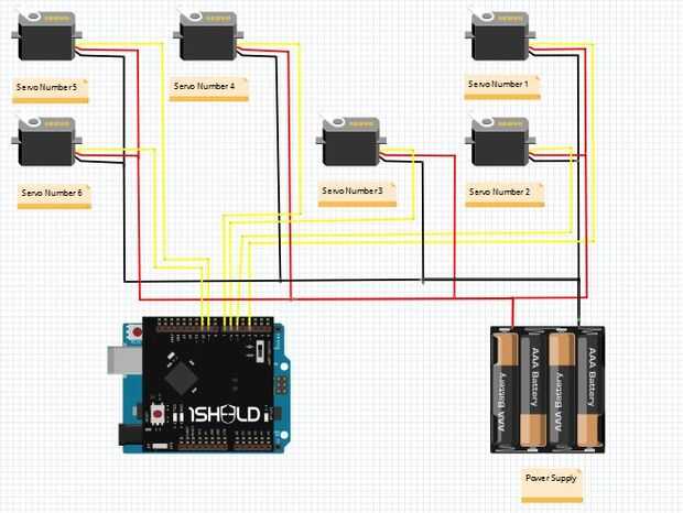 En primer lugar, la conexión del circuito del motor fue bien ilustrado en la hoja de datos de brazo antes mencionados, por lo que conectar el + ve y - ve terminales de los servos para el circuito del motor