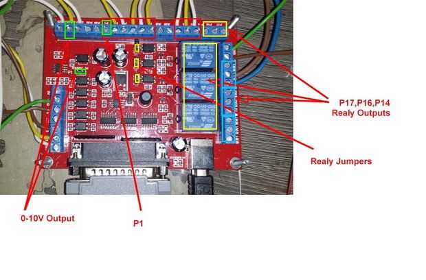 Pensar que tener cuidado es que el P1 se utiliza también para salida 0-10V (mach 3 pwm). Si la configuración de control del motor. evitar el uso de P1 como usted puede para pwm. en la imagen los conectores está en color verde. El puente verde si desactiva la salida 0-10V.