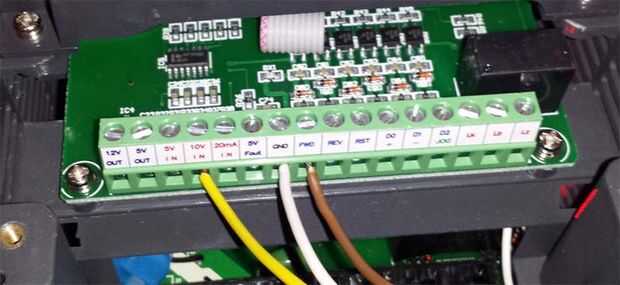 5V, 10V, 20mA pulg son insumos que puede utilizar para ajustar la velocidad de su eje. Utilizo el 10V entrada como mi señal de tablero de control 0-10V (cable amarillo de VFD)