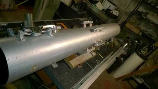 Una de las complicaciones de un telescopio newtoniano de eqmounted es que el ocular puede terminar en algunas colocaciones muy torpes así que un tubo giratorio es una necesidad. Desafortunadamente Anillos giratorios son muy caro y no es fácil de hacer desde cero, así que se ocurrió este intrincado método de construir 6 canales que pueden doblar como asas de transporte. Para fijar el tubo a la cola de Milano, construí un conjunto sujeción secundario a la cola de Milano que el canal se adapta a todo. Así que tengo un gótico mirando muchas espinas OTA inspirado por la nave de minero Romulano de la primera película de Star Trek...