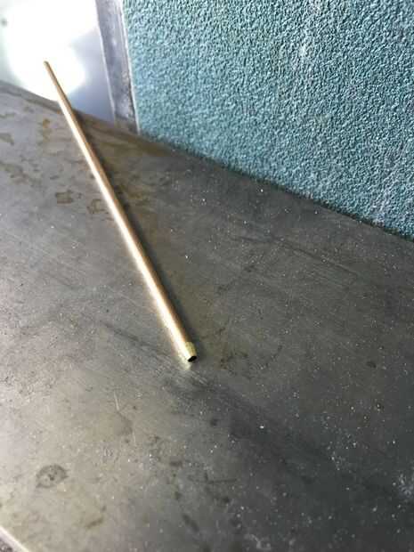 En orden para que el agua gotee, tienes que tener un sifón en el frasco superior, de lo contrario terminas con un vacío y agua no va a salir. Para ello he insertado un tubo de latón en el tope junto a la válvula. Corte el tubo de latón a unos 6" de largo.