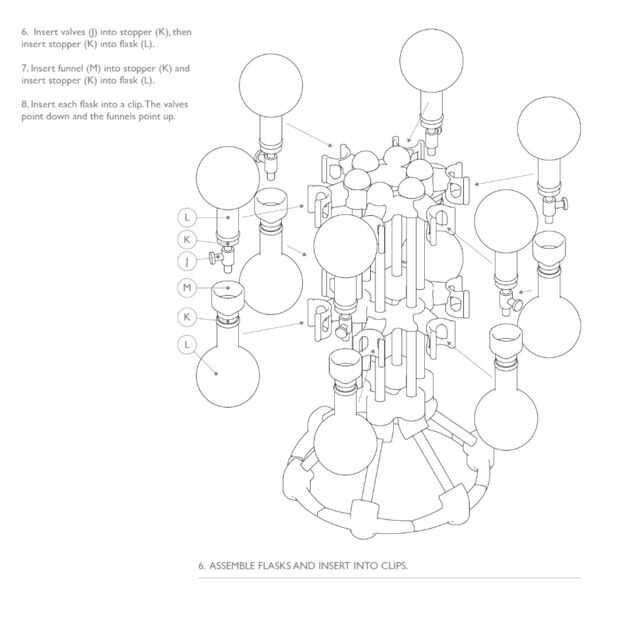 Inserte la manga embudo en seis de los hirviendo frascos primero, luego inserte los embudos de filtro en las mangas de embudo. El orden es importante, porque los embudos de filtro no son preciesly en forma y pueden ser un poco más grandes que el tamaño estándar para que los embudos están diseñados. Hacerlo en este orden evitará presión indeseada en el cuello del matraz que podría causar que romper.