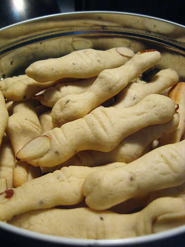 Compruebe estos dedo lamiendo delicias. Estas galletas de shortbread utilizan una masa mexicana semillas de anís para dar un poco más picante y añadir algunas manchas agradables a los dedos. Almendras rebanadas y marcas de cuchillo en los nudillos tacos hacen un bonito detalle inquietante.