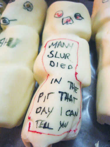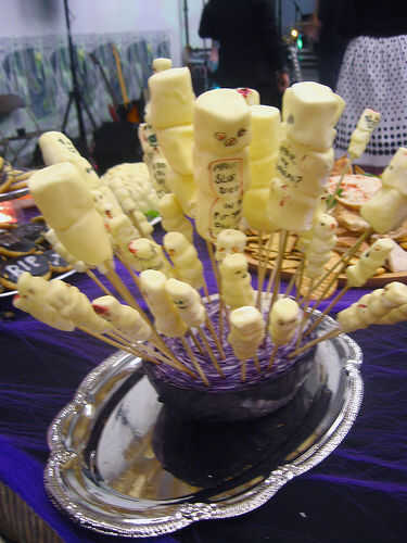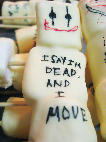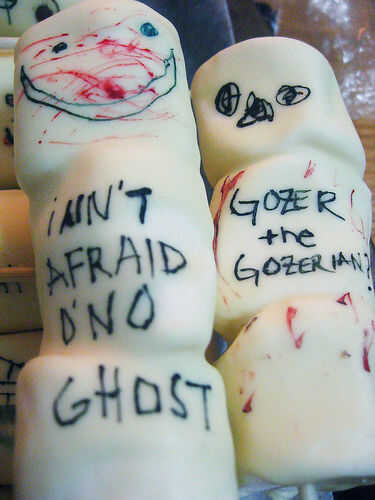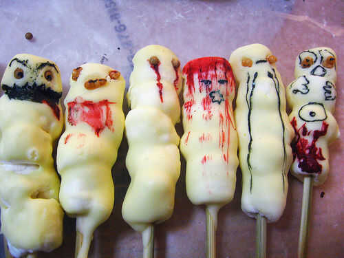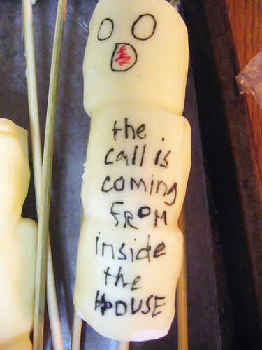 Decoramos sumergiendo un pincho en rojo y negro alimentos para colorear y dibujar caras y escribir cotizaciones de nuestras películas de terror favoritas.