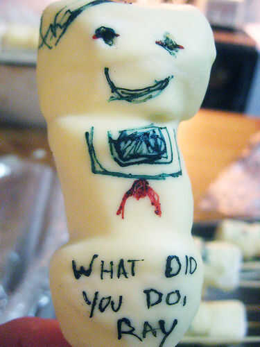 Son super fáciles. Derritieron chocolate blanco y la cera de parafina a baño María. Luego preparamos brochetas de malvaviscos grandes y pequeños. Sumergido en el chocolate derretido a la capa y permitir que se sequen.