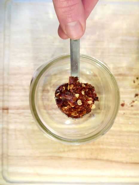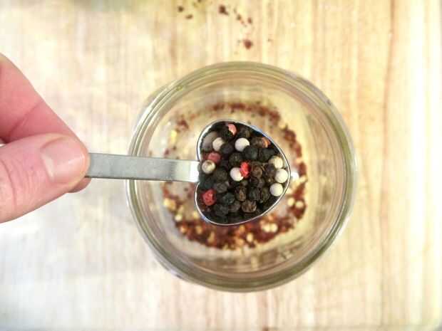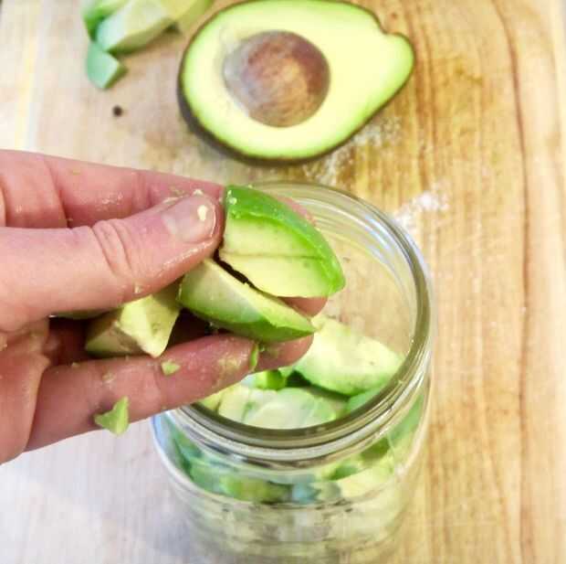 Con su tarro de masón limpio, añadir la cucharada de hojuelas de pimiento rojo, así como su cucharada de granos de pimienta. Añadir el aguacate en rodajas/en cubos hasta que sea aproximadamente una pulgada por debajo del tarro.