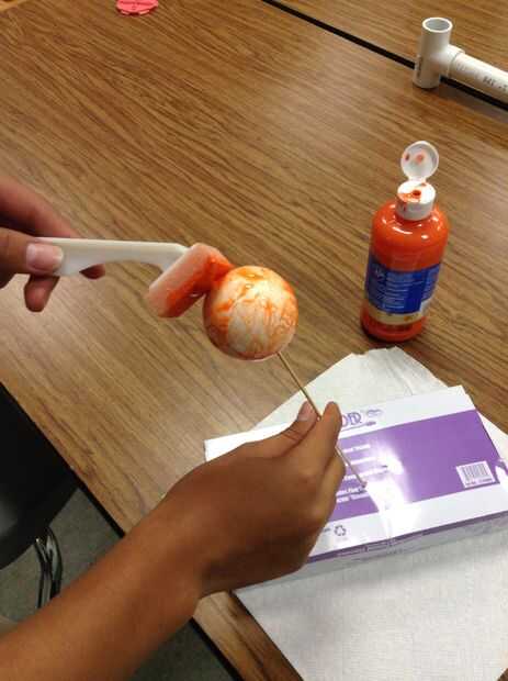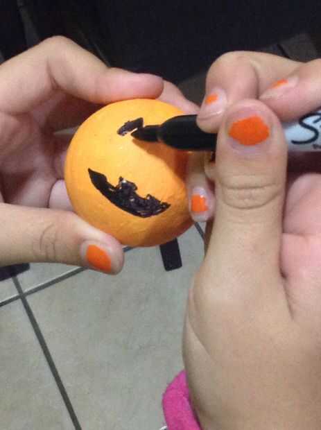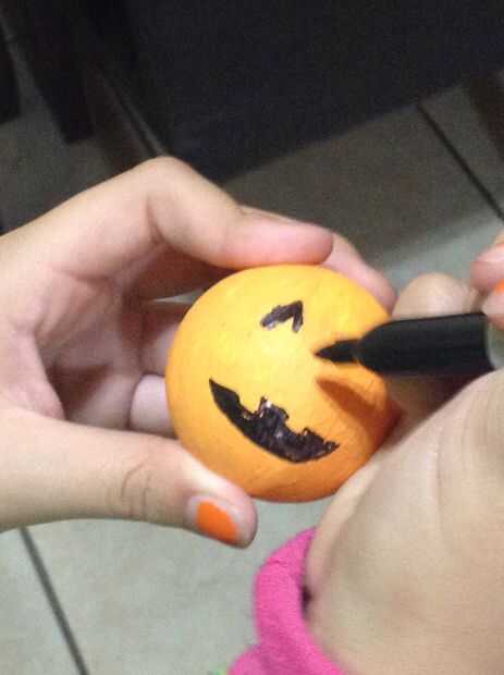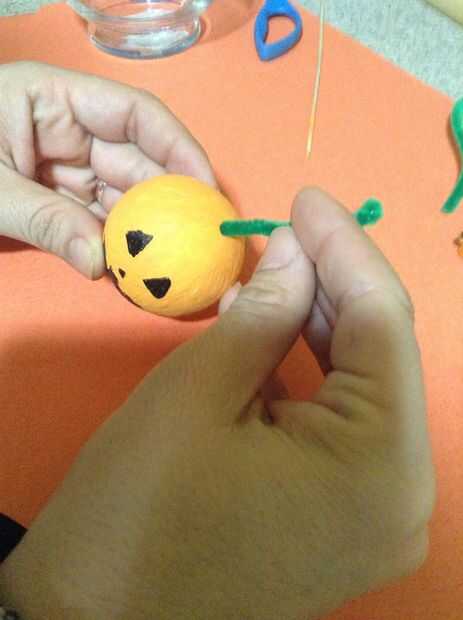 Con pintura naranja, capa de una pelota de espuma de poliestireno varias veces hasta alcanzar el tono deseado de color naranja. Entonces, usando un rotulador cara pintura marcador Jack-O-Lantern. Por último, coloque un trozo de limpiador de pipa verde para crear un tallo de la calabaza.
