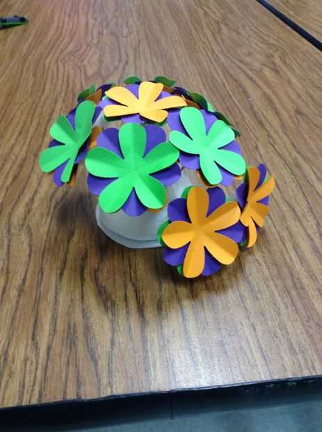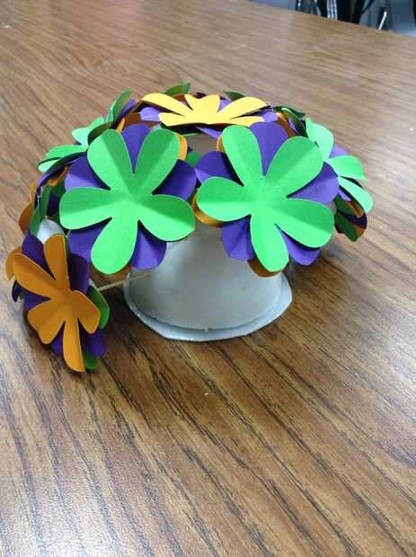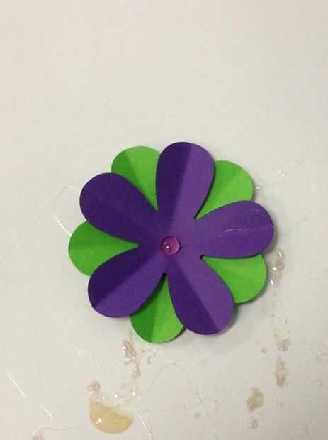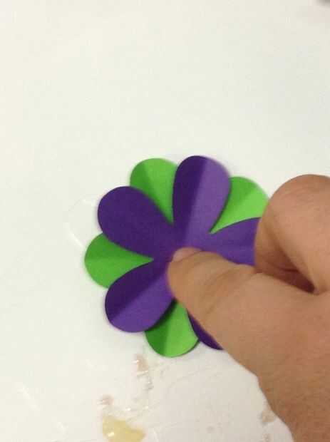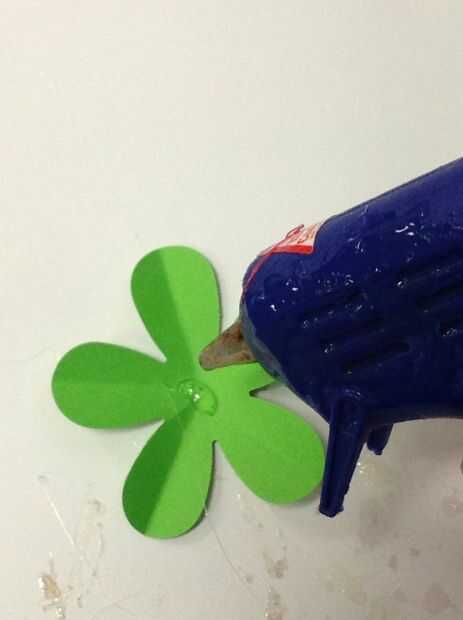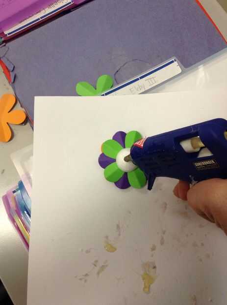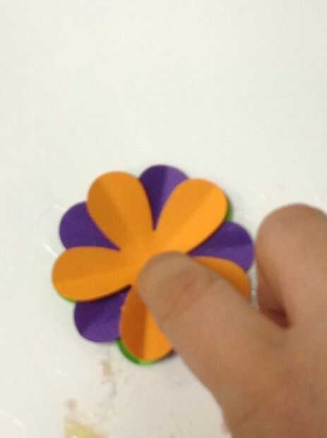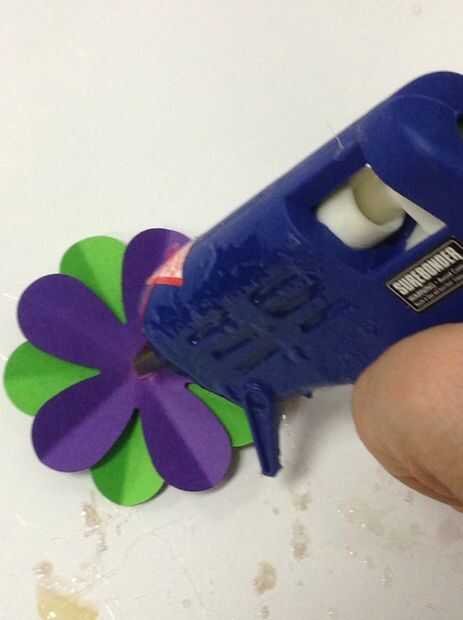 Usando la pistola encoladora, coloque un pequeño punto de pegamento caliente en el centro de una flor. Luego, coloque una segunda flor doblada encima de la flor que tiene el pegamento. Los colores deben ser visibles. Los pedales deben crear una rueda de color patrón. Por último, lugar un tercer doblado flor de un color diferente en la misma dirección donde colocaste la flor inicial. .