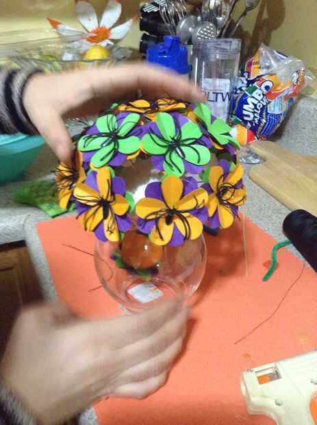 Utilizando la pistola encoladora, colocar pegamento en el centro de la abertura del círculo del paso 8 y pegar la mayor media una bola de espuma de poliestireno. Luego, comenzar a colocar las flores en la bola de espuma de poliestireno recientemente pegado. Comenzar con la flor del centro como se muestra en las fotos y continuar a colocar flores al lado. No dejar ningún espacio vacío, pero evitar el hacinamiento así.