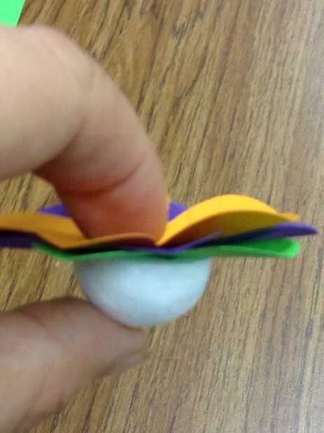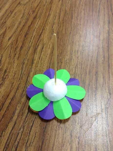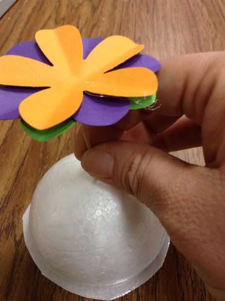 Con la mitad de una pelota de espuma de poliestireno, colocar pegamento en la parte posterior de una flor y coloque el extremo plano de la bola de espuma de poliestireno. Luego, coloque un pequeño punto de pegamento en la superficie curva de la media bola de styrofoam ya pegado y coloque un palillo de dientes a través de la espuma de poliestireno. El palillo de dientes será el tallo de cada flor. Repita el paso 7 hasta que todas las flores tienen un tallo.