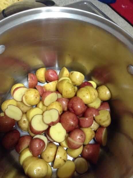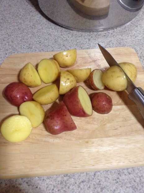 Cortar cada patata por la mitad. Esto permitirá que la patata absorba más sabor.