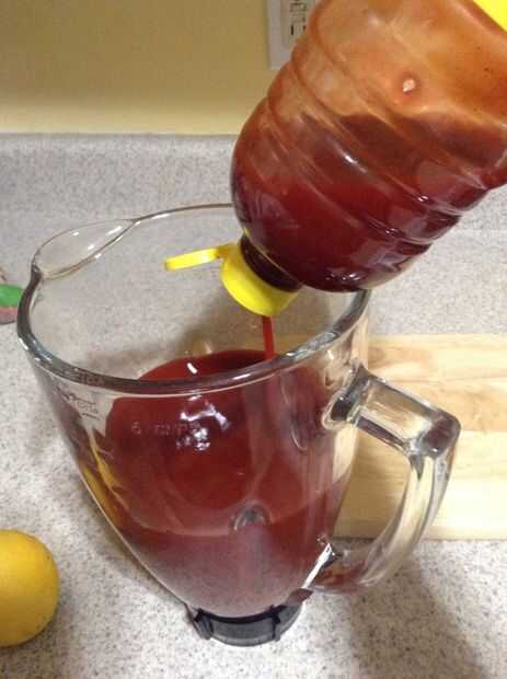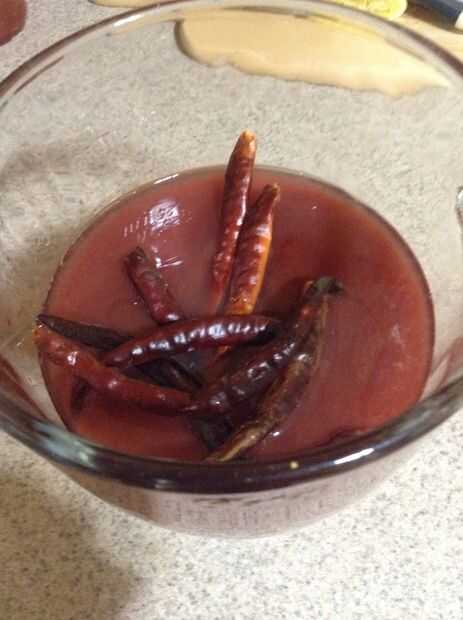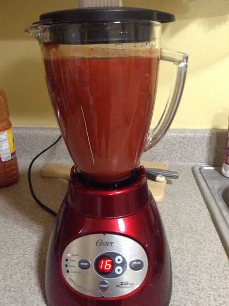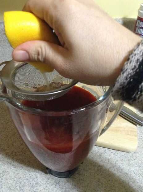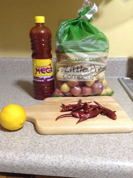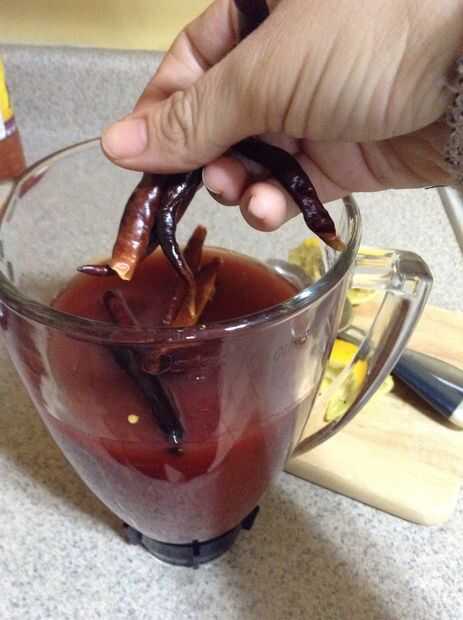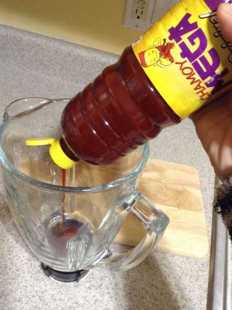 Verter el contenido de una botella de chamoy de 33 onzas en la licuadora. Exprimir un limón entero o limón y verter el jugo en la licuadora. Dependiendo de lo picante te gusta la comida, colocar unos pimientos asados en la licuadora (coloqué 7-10). Se mezclan los tres ingredientes.