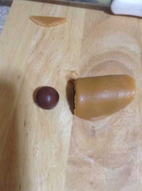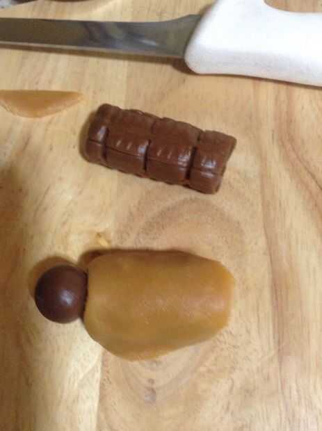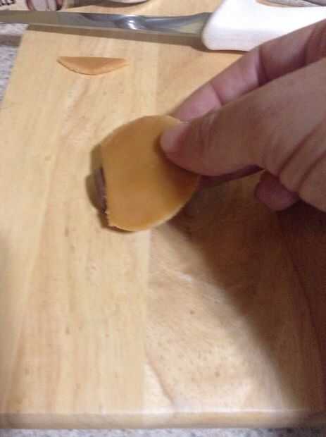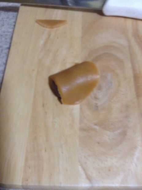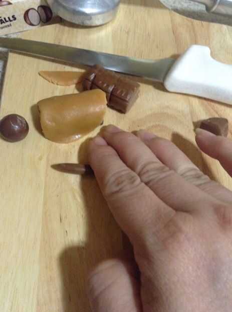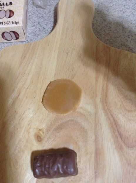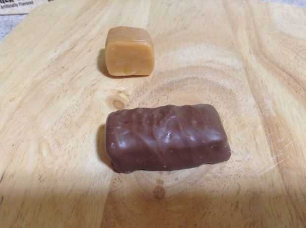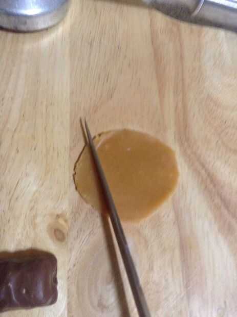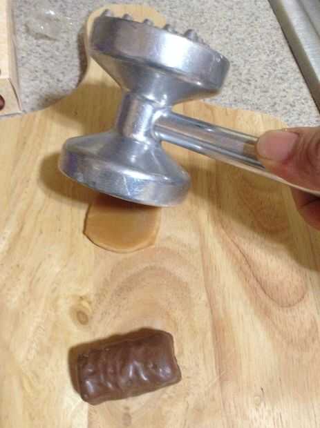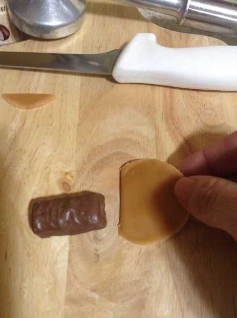 Use un ablandador de la carne para aplanar el caramelo. Luego, corte un borde recto de caramelo como se muestra en las fotos. Cubrir el Twix bar usando el caramelo caramelo aplanado.