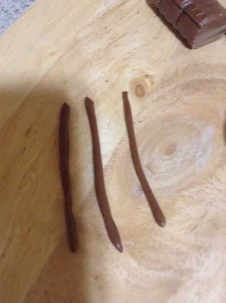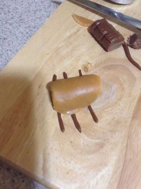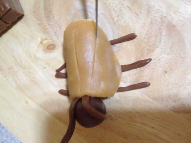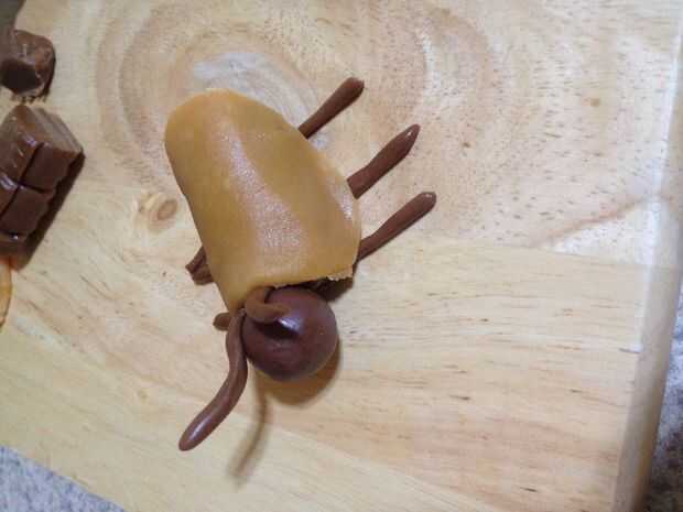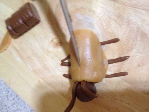 Usando un Tootsie roll, rollo de un pequeño trozo de tootsie roll hasta que esté lo suficientemente delgada como para ser las patas de insectos. Hacer cuatro tiras largas. Colocar tres tiras sobre una superficie plana y coloque la barra de Twix cubierta caramelo en la parte superior. Luego, coloque la tira cuarta en el final de la barra de Twix y finalmente coloque una mentira como la cabeza.