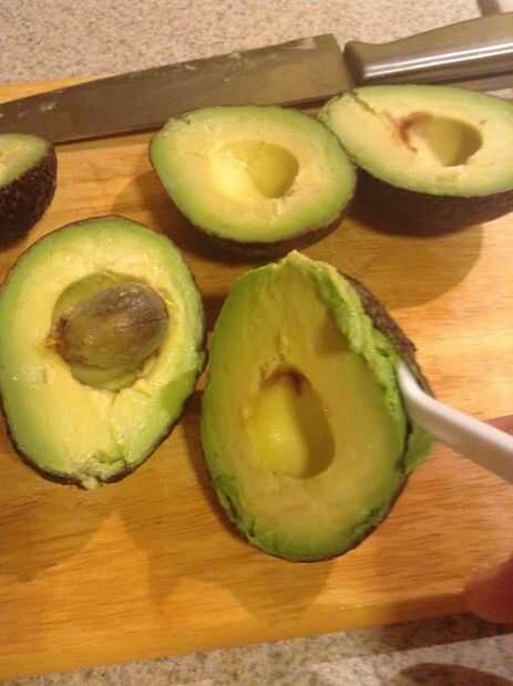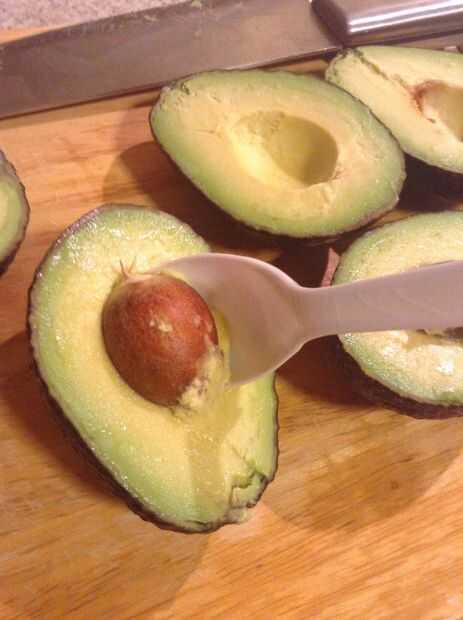 Cortar los aguacates por la mitad. Quitar los hoyos con una cuchara y reservar. Sacar el aguacate con una cuchara y coloque en una licuadora.