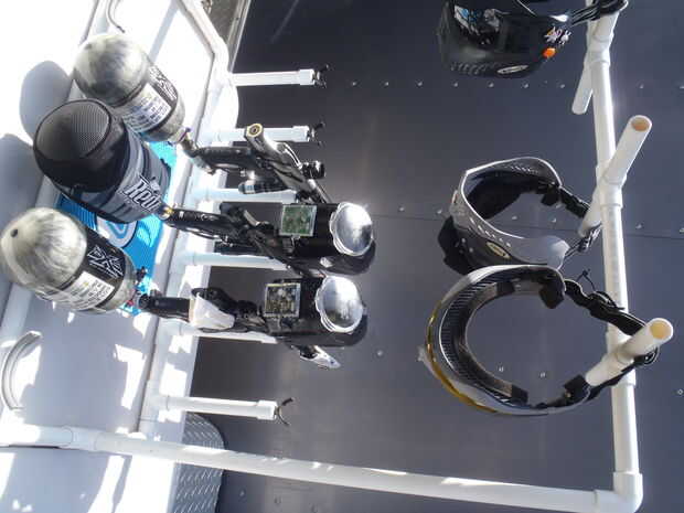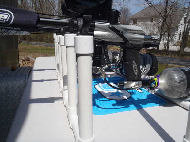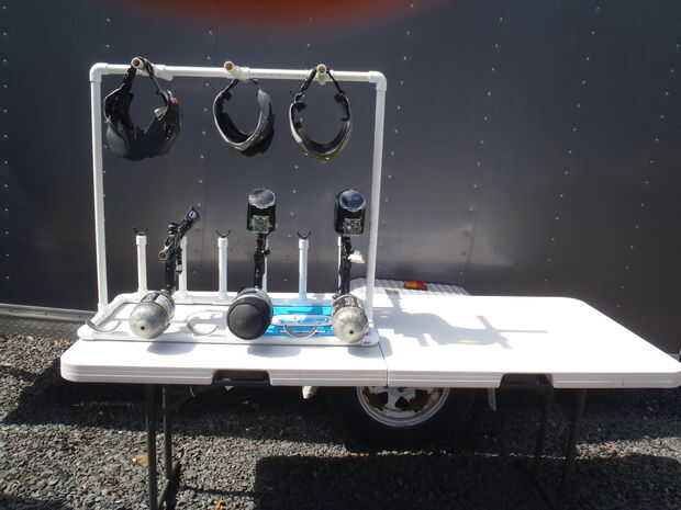 Requisitos para la parrilla tendría que ser: tiene como mucho engranaje como sea posible, mantenga el ordenadamente y con seguridad, rompe para recorrido en tan pequeño tamaño como sea posible, fácil de armar nuevamente y ser luz para viajar. Cada rack está diseñado para caber en 1/2 de una tabla de 6 pies, por lo que podemos poner 12 armas y máscaras por mesa. Actualmente tenemos cuatro de estos bastidores para todos los jugadores del equipo a utilizar.