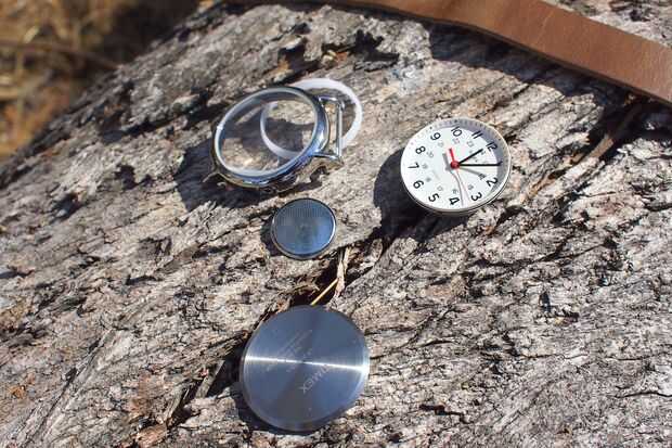 Con la parte posterior del reloj quitado, el resto de componentes se puede quitar fácilmente de la carcasa del reloj. El frente de cristal del reloj es también presión ajuste en su lugar y puede golpear con cuidado fuera de la carcasa de metal con un palo romo o rock envuelto en paño.