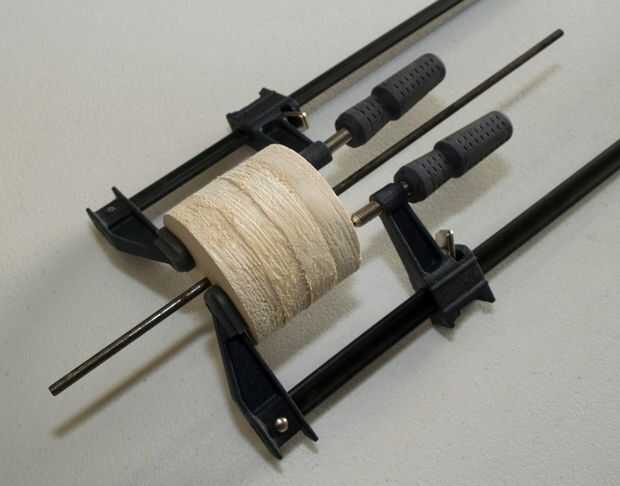 Pila los 4 discos hasta asegurándose de alinear el grano para lograr un aspecto uniforme, aplicar pegamento para madera a las superficies de contacto y de la abrazadera hasta que sequen. Ayuda a correr una barra de ¼" a través del orificio piloto hecho por el agujero Sierra para alinearlos. Una vez seco, perfore a través de la parte superior tres discos con 3" de bits, aunque si lo desea, puede ir menor sólo significa que el vidrio estará más en el pozo. ¿Adivina qué? La perforación está casi listo! La izquierda lo único que es aumentar el tamaño del agujero en el centro de la pieza inferior de 1/8" a ¼".