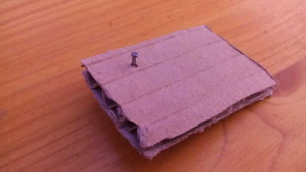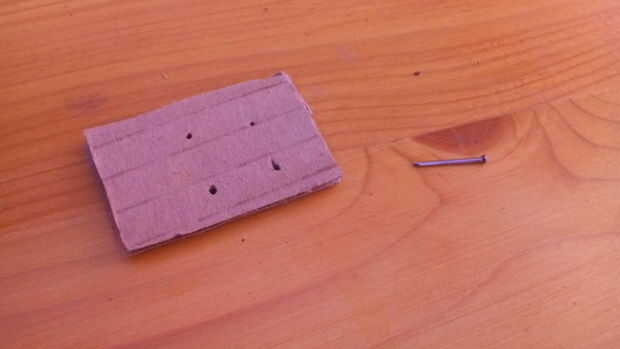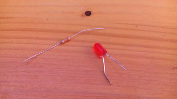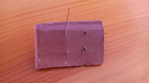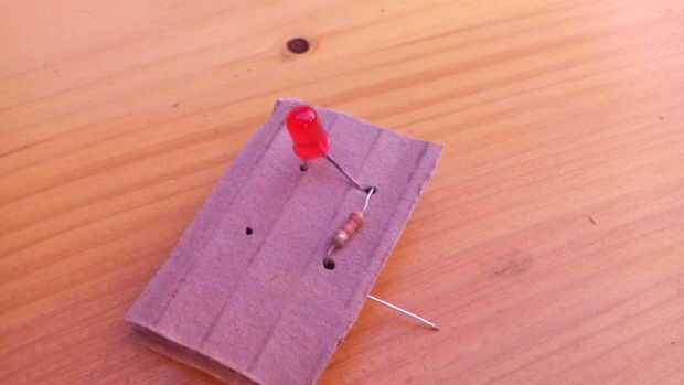 Si usted no tiene PCB cuando estás haciendo un proyecto puede utilizar cartón para reemplazarlo. Ejemplo aquí es este LED con la resistencia, y sólo necesita hacer los agujeros con una aguja de conectar las piezas y luego soldarlos juntos. Si no estoy en casa uso este hack de vida muy con frecuencia.