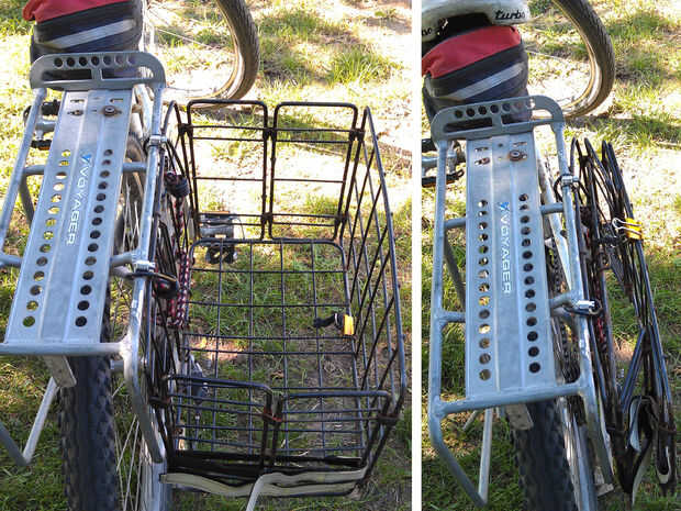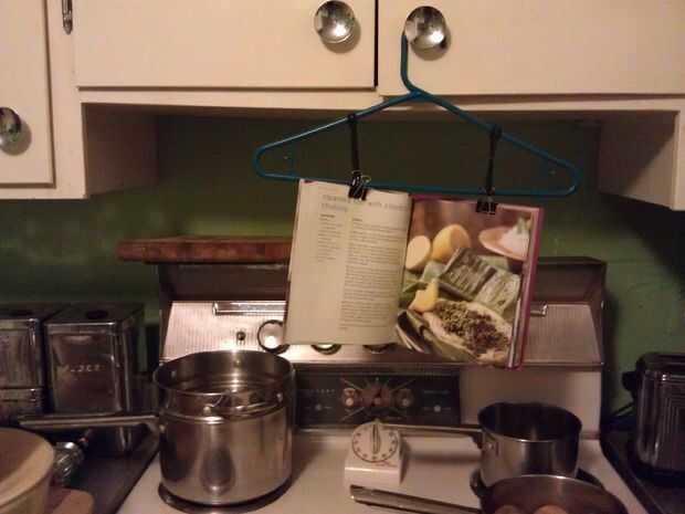 El clip binder poderoso puede hacer aún más cuando se empareja con un lazo de pelo.  Aquí está, sosteniendo un libro de cocina y también bloqueo mi cesta de la bici en su lugar.