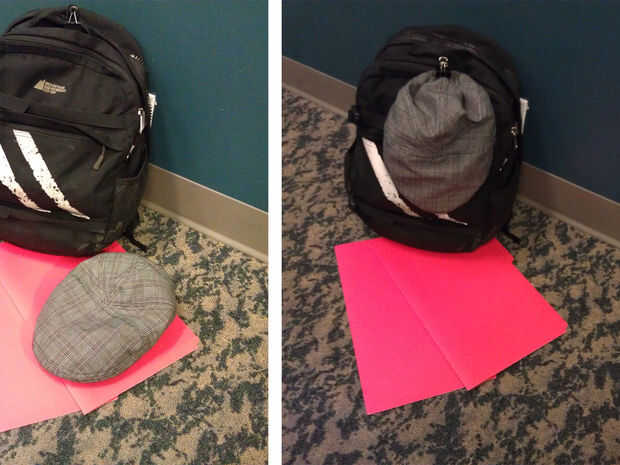 El gimnasio (o el parque o la playa) no siempre tiene un lugar para un sombrero. En lugar de romper mi sombrero en mi bolso, enganche al lado. En la foto: un clip binder, azotó a agarrar de mi mochila, con un lazo de pelo.
