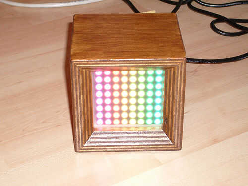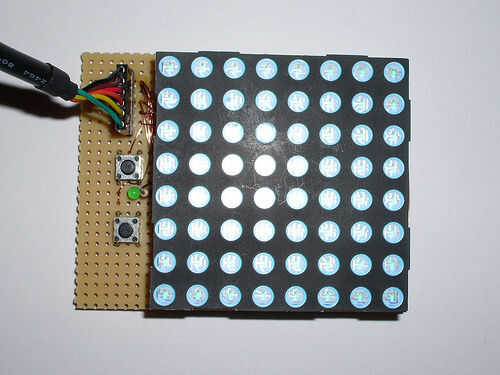 esta indicación se basa en una matriz de LED RGB de 8 x 8. Para propósitos de prueba fue conectado a un tablero estándar de Arduino (Diecimila) utiliza 4 registros de desplazamiento. Después de conseguir que funcione lo permatized en un PCB fabbed. Los registros de desplazamiento son 8 bits y son fácilmente conectados con el protocolo SPI. Modulación de anchura de pulso se utiliza para mezclar los colores, más en eso más adelante. Parte de la RAM de la MCU se utiliza como un framebuffer para sostener la imagen. La RAM video es analizada por una rutina de interrupción en el fondo, por lo que el usuario puede hacer otras cosas útiles como hablar a un PC, leen botones y potenciómetros.