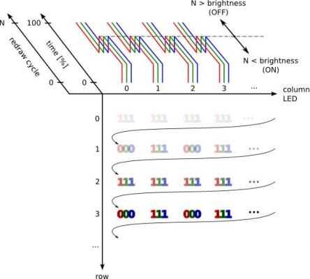 Imagen (1) ilustra el principio de funcionamiento del algoritmo PWM. Dicen que el código se da un valor de 7 para el brillo de LED(0,0). Además sabe que hay un máximo de pasos de N en brillo. El código ejecuta N lazos para todos los posibles niveles de brillo y los lazos necesarios para cada LED individual en todas las filas. En caso el contador de bucle x en el circuito de brillo es menor que 7, el LED se enciende. Si es mayor que 7, el LED se apaga. Haciendo esto muy rápidamente por todos los LEDs, los niveles de brillo y colores base (RGB), cada LED puede ser ajustada individualmente para indicar el color deseado.