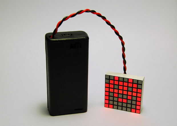 y eso es todo. Inserte dos pilas AA o recargables y enciéndalo. Cada vez que encienda, muestra uno de los mensajes de texto o animación preprogramados.