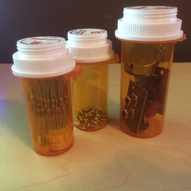 (21) electrónica - electrónicas aficionados lidiar con un montón de pedazos, de LEDs y las resistencias y condensadores pequeños microchips. Grupo como objetos en una botella de la prescripción, o uno para sostener las piezas necesarias para un determinado proyecto. Heck, lanzar en el esquema en la botella (o en la etiqueta, si es bastante simple) y pueden tener un kit para la construcción de ese circuito. Esto podría ser una gran manera de empaquetar un kit para que otros puedan construir.