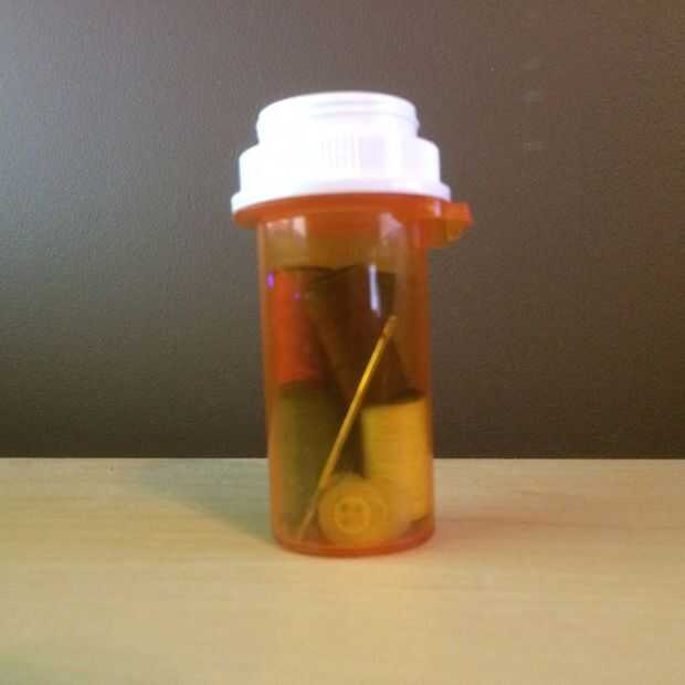 (33) ¿cinta del conducto - No, un rollo de cinta adhesiva posiblemente no cabe dentro de esta una botella pequeña, derecha? No, no con la cartulina grande del rodillo en el centro, pero, como puede ver, el lado pegajoso de la cinta del conducto no es difícil sacar el lado no adhesivo de la cinta... que es cómo desenrollar en primer lugar. Por lo tanto, tomar un pequeño pasador (o un lápiz roto) y cuidadosamente comenzar a rodar alguna cinta fuera el rollo y a su pasador para hacer un carrete mucho más pequeño. Ahora, sólo necesitas una botella de la prescripción que es lo suficientemente alta que usted puede poner la tapa sobre él con la espiga dentro y que necesita para asegurarse de que usted deje de agregar cinta adhesiva antes de que sea demasiado grueso alrededor caber en la botella. -O - si usted no se preocupa por mantener el pequeño tamaño de la botella o mantener su cinta de conducto seco, puede utilizar la botella sí mismo como el carrete nuevo y cuidadosamente Envuelva la cinta alrededor del exterior de la botella. Terminarás con un rollo pequeño de cinta adhesiva con un contenedor de almacenamiento ingenioso en su centro, perfecto para un mini-rotulador para etiquetar lo que llevar.