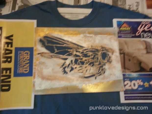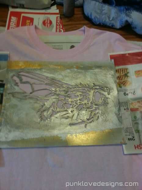 • Hacer una plantilla. Si es corte de papel, rociar algunas impresiones con un brillante, pintura flexible para asegurar que no desmoronarse cuando está mojado. Rust-Oleum pintura metalizada es como una mágica plantilla conservante para mí. Acabado mate nada garantiza una plantilla frágil, grietas dentro de 10 o más impresiones.