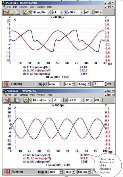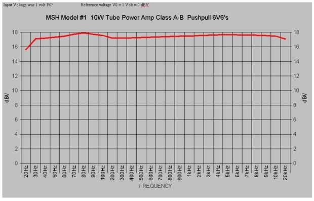 La carta de respuesta de frecuencia se creó utilizando un pequeño programa en VB que he creado. Si alguno quiere una copia por favor un correo a MS. Holden y le enviaremos una copia del programa. Las costuras de la amp a sufrir desempeño por debajo de 30hz. Esto depende del nivel de la tensión de entrada así que elegí un nivel arbitrario.
