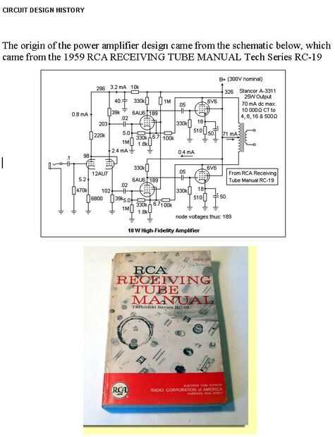 El origen del diseño del amplificador de energía provino el esquema siguiente, que vino desde 1959 RCA recibir tubo MANUAL Tech serie RC-19