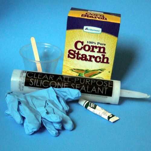 La mezcla estándar de Oogoo consta de calafateo de silicona 2 de almidón de 1 maíz por volumen. Generalmente se mezcla en pequeñas cantidades para que pueda ser formado o emitido antes de que empiece a endurecer para arriba. Normalmente mezclo no más de 3 cucharadas de sellador de silicona a 1-1/2 cucharadas de almidón de maíz. Para más detalles sobre cómo mezclar Oogoo ver aquí:
