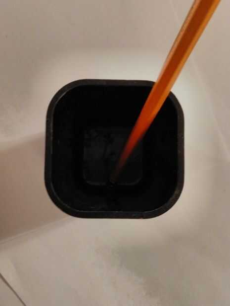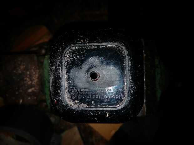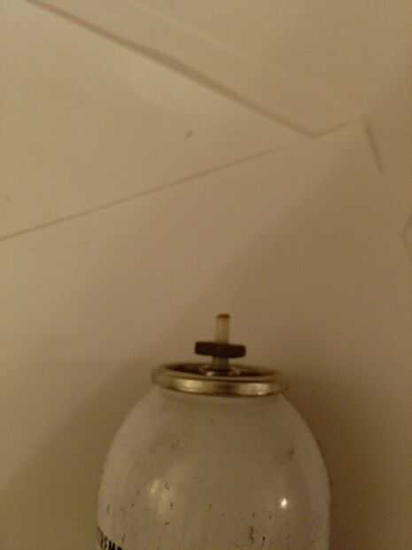 En el centro del orificio del lápiz, donde la punta de la parte inferior de butano va cuando está en la base principal. El agujero debe ser lo suficientemente grande como para caber en la punta de la botella de butano a través pero lo suficientemente pequeño para dejar la tuerca de ir a través. De esta manera cuando el bot