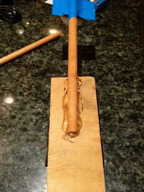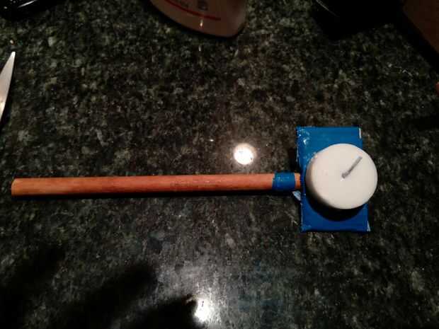 Cortar unos rectángulos de tablero de tarjeta como una base para la vela. Pegarlas con cinta adhesiva. Usando más cinta adhesiva Fije la vela base al pasador largo que no utilizada para el gatillo. Luego pegar la vela a la base de la vela con pegamento caliente. Tenga cuidado de la fusión de la cera. Usando una cantidad abundante de pegamento Fije la vela entera monta al frente de la base principal.