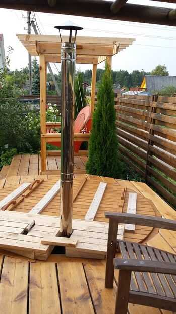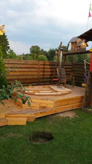Dentro de la bañera de hidromasaje es una estufa de leña. Unos 10 kgs de briquetes de madera calienta el agua bastante bien en el verano.