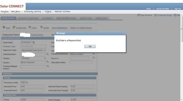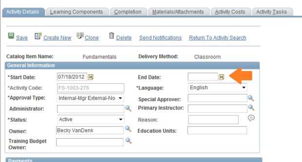 Actividades de aula como instructor condujeron sesiones usualmente tendrá una fecha de finalización. La fecha de inicio y final identificar cuando una actividad empieza y termina. La fecha de finalización es necesaria para las actividades que tienen una fecha de finalización definida para que los estudiantes no están confundidos e inscriban en un evento de entrenamiento pasado.