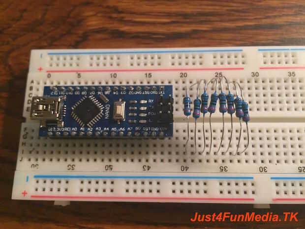 Coloque una vez resistor para cada segmento en la pantalla. Resistores se utilizan en el lado caliente (positivo) de la pantalla para que la pantalla no va a cambiar en el brillo cuando múltiples segmentos se iluminan.