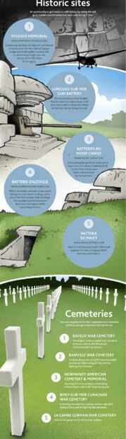 Estos son lugares para presentar sus respetos a quienes perdieron sus vidas en ambos lados durante la guerra. Existen 5 cementerios de guerra - Bayeux Ranville, americano de Normandía, cementerio canadiense de Beny-sur-mer y alemán de La Cambe.