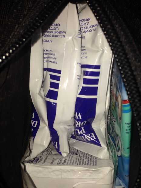 La mejor manera que encontré para todo lo nuevo en conseguir es empezar a colocar las barras de alimentación permanente a un lado y luego colocar las toallitas y agua en el espacio restante. Luego colocar los artículos de primeros auxilios, frasco y manivela linterna de eso.