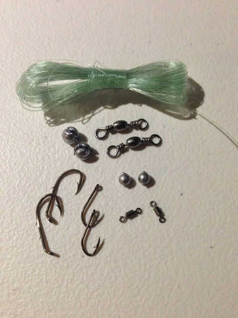 Esta es la pequeña de la pesca que añadí, que contiene aproximadamente 30 pies de línea de pesca de prueba de 30 lb, eslabones giratorios, pesos y ganchos.