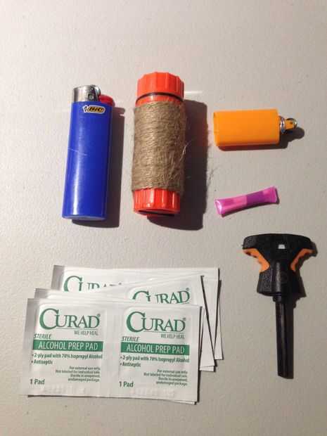 En el tubo naranja son bolas de algodón cubiertos con vaselina, envuelto alrededor del tubo es guita del yute que puede ser pelada hacia fuera. Ambas opciones sólo necesitan una chispa para encender. Encendedor Bic estándar y un Bic vacío más ligero se convierte en una herramienta chispas. La barra ferrocerium de mi cuchillo y mi pluma Schrade.