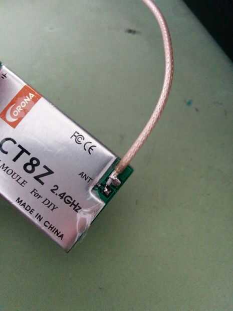 Usted también necesitará soldar el cable de la antena en el módulo de 2.4 GHz. Soldadura interior parte de la antena a una soldadura pad y la sección exterior en el otro plato de soldadura.