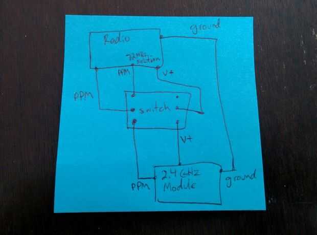Para este proyecto, he intentado aislar completamente el poder y las señales PPM entre la frecuencia de cada módulo con el tirón de un interruptor. No era totalmente acertado debido a tener que quitar el cristal para el modo de 2,4 GHz. En el futuro me gustaría averiguar cómo aislar completamente el poder del modo de 72 MHz para reducir el consumo de la batería cuando se utiliza el nuevo módulo y para permitir que el cristal ser instalado en modo de 2,4 GHz.
