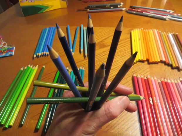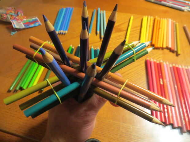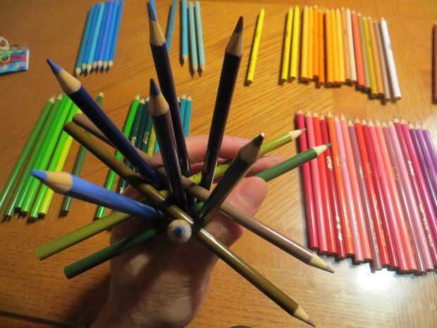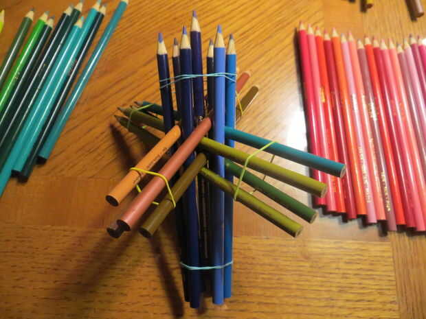 He incluido a continuación del vídeo de Alejandro ya muestra realmente muy bien cómo hacer los primeros pasos de la construcción, que son los más difíciles. Estos se componen de grupos de lápices apunta en cuatro direcciones diferentes (dispuestas tetrahedrally, para aquellos interesados en la geometría, que significa que cada lápiz es paralelo a o a 109,5 º para los otros lápices en la estructura). Decidí apuntar todos los puntos hacia arriba, por lo que la escultura tiene un exterior máximo puntiagudo, pero arreglar como le parezca.