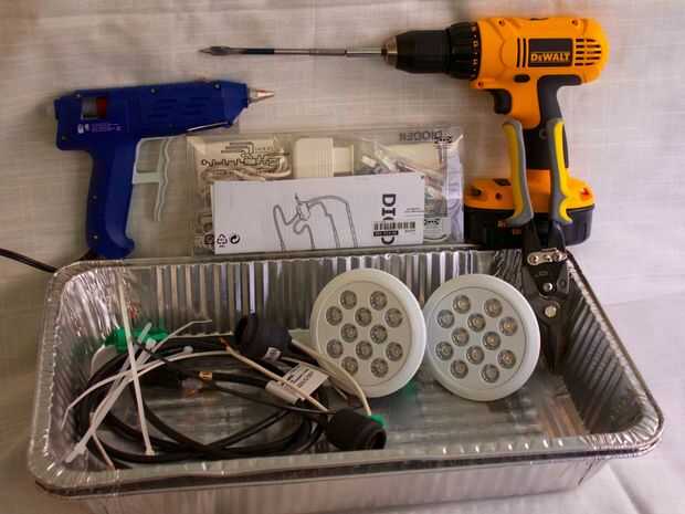 Pegamento caliente, taladro, tijeras para metal, antiguo cable de extension - no incluido en precio